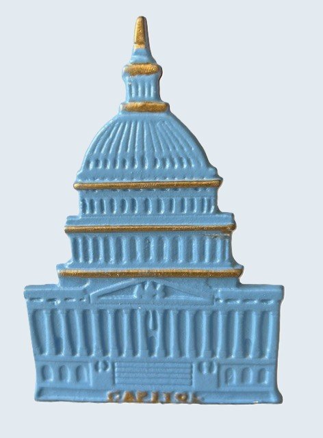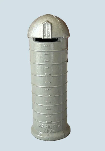 This cast iron bank was designed by Gordon Shroff. As was the case with other SBCCCA banks, Laverne Worley was responsible for the bank pattern. The bank was assembled from three pieces and measures 4 ΒΌ high x 4 9/16 wide x 2 7/8 inches deep. The oval shaped mound represents Mound City (St. Louis) upon which the Old Courthouse, and the Gateway Arch are placed.