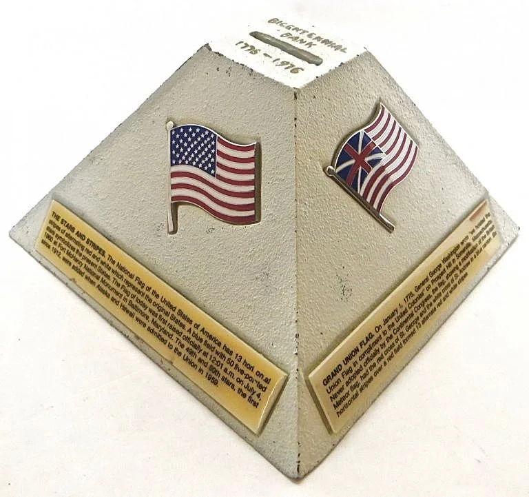 This cast iron bank was made to commemorate the 200-year anniversary of America. It is inscribed at the top 1776-1976. The bank is painted in white with four metal flags applied and a description of each below in a recessed enamel βtag.β The base plate is embossed βStill Bank Collectors Club of America and βLimited Edition of 200.β³